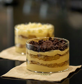 Homemade passion fruit mousse, filled with crushed biscuits and topped with chocolate shavings.